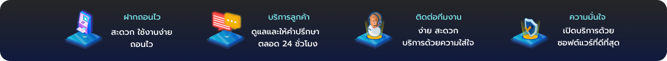 ระบบอัตโนมัติของเราทำงานตลอด 24 ชั่วโมง ไม่มีวันหยุด คุณสามารถทำรายการได้ทุกเมื่อที่ต้องการ ไม่ว่าจะเป็นช่วงดึกดื่นหรือช่วงเช้าตรู่ ระบบจะประมวลผลทันทีที่คุณกดยืนยันการทำรายการ นอกจากนี้ เรายังรองรับการทำธุรกรรมผ่านธนาคารชั้นนำทุกแห่งในประเทศไทย รวมถึง True Wallet ทำให้สมาชิกมีความสะดวกสบายในการเลือกช่องทางที่ตนเองถนัด